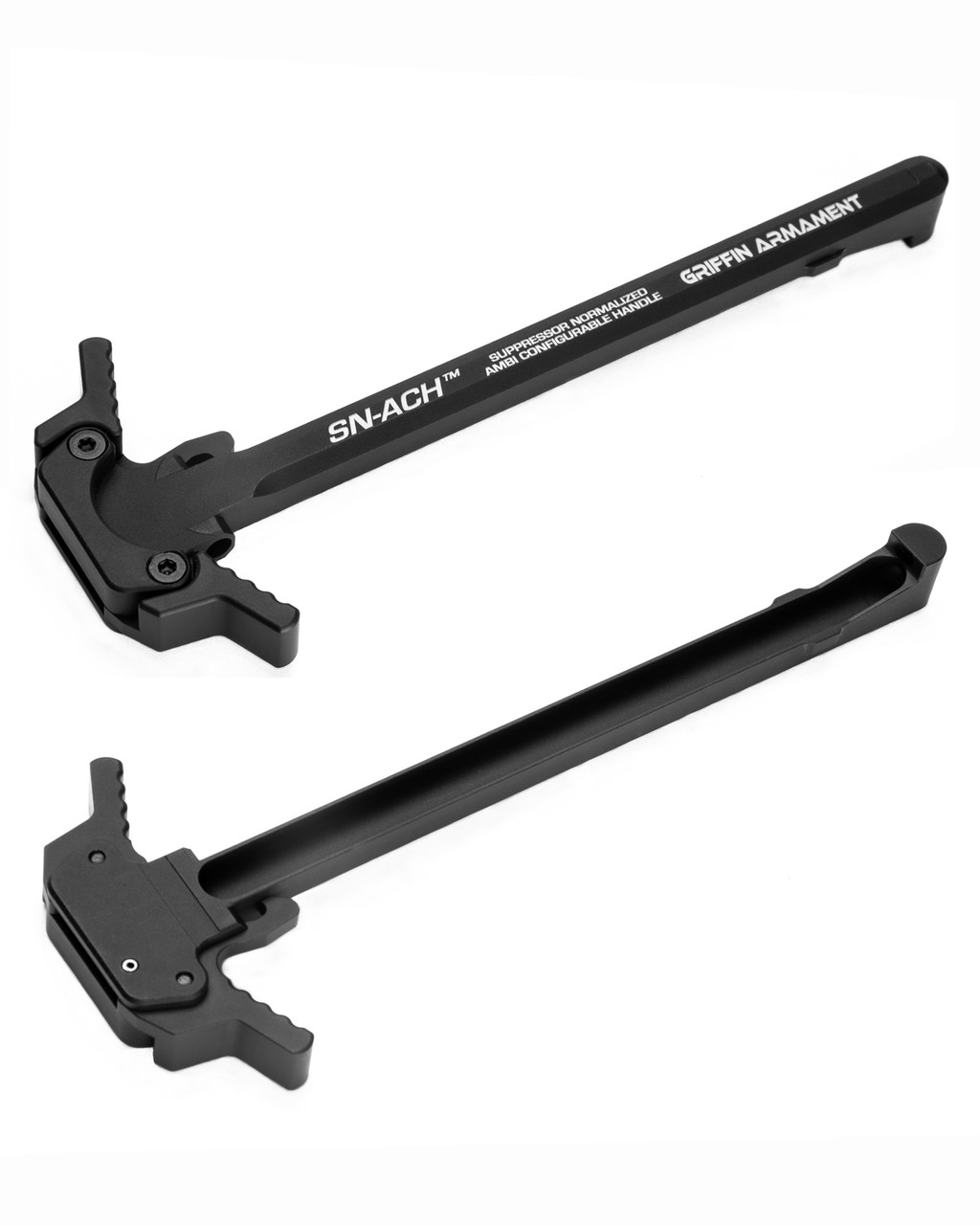 The SN-ACH™ (Suppressor Normalized Ambidextrous Charging Handle) is a patented, modernized, feature filled charging handle that will satisfy any AR15 user. The SN-ACH™ features a gas check groove and a suppressor gas vent that reduces gas in the face of the shooter when using a suppressor. Configurable levers were also added so that a user could choose to run the included large lever, which works with gloved hands, or purchase and modularly use the smaller levers (available separately) without having to buy an entirely new handle at a excessive cost. The bolt carrier engaging hook features durable reinforced geometry for 30% increase in strength over milspec handles and approximately 3 times as strong as inferior 6061 handles which routinely break under hard use. Fitment bearing surfaces on the handle mating ensures reduced wobble fitment with the AR15 and AR10 upper receiver. The handle is made from 7075-T6 aluminum and hard coated for optimal wear resistance- the Griffin SN-ACH is the finest charging handle available for the AR series family of firearms.